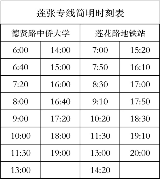 首末班车:莲花路地铁站 7:00~20:00;德贤路中侨大学站 6:00~19:00,全程线路约53公里,票价为9元。