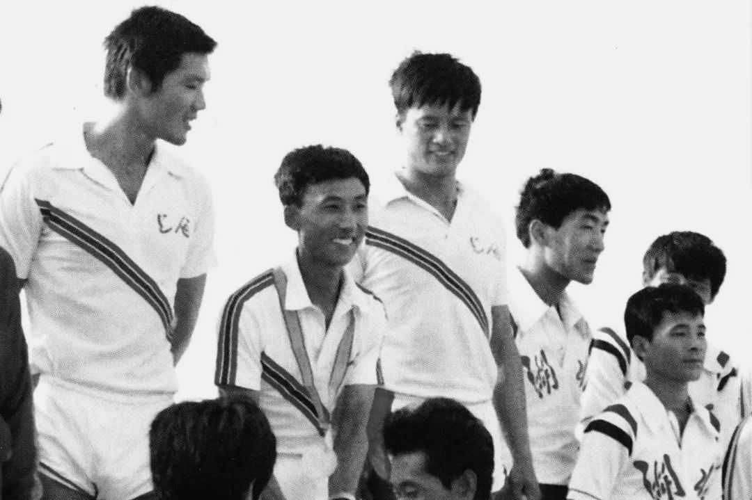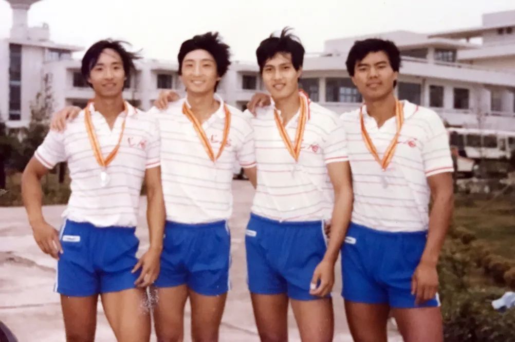 1984年,上海队四人双桨赛艇运动员参加全国锦标赛后合影,从左至右:朱文煜、梁波、郁军、陈坚