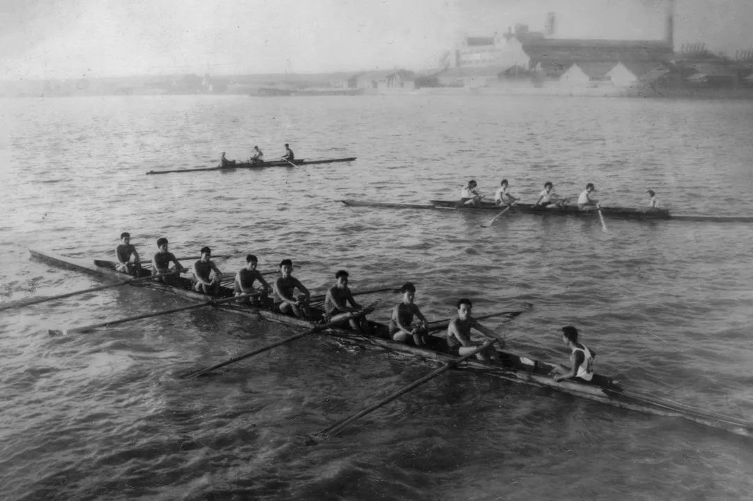 1964年,上海赛艇运动员在龙华港口上海市划船俱乐部训练