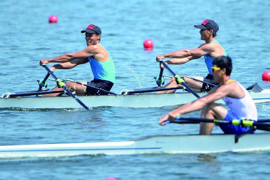 2013年9月3日,上海赛艇运动员董天峰(左)、李辉(右后)夺得第12届全运会赛艇2000米男子轻量级双人双桨金牌
