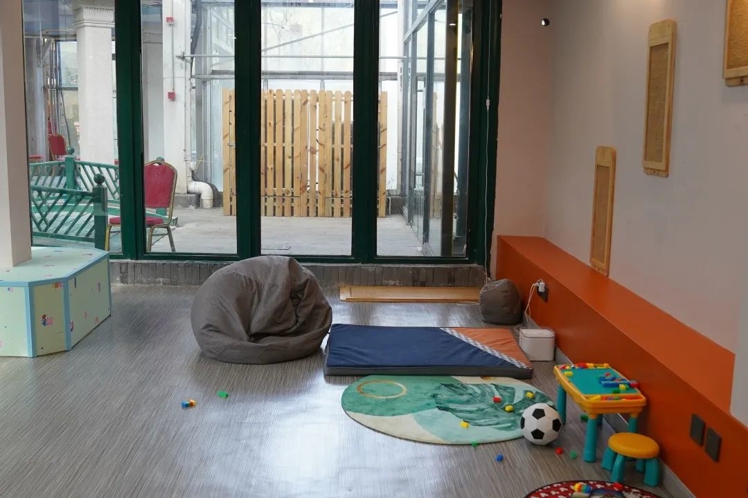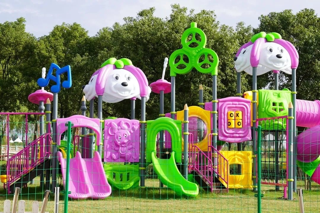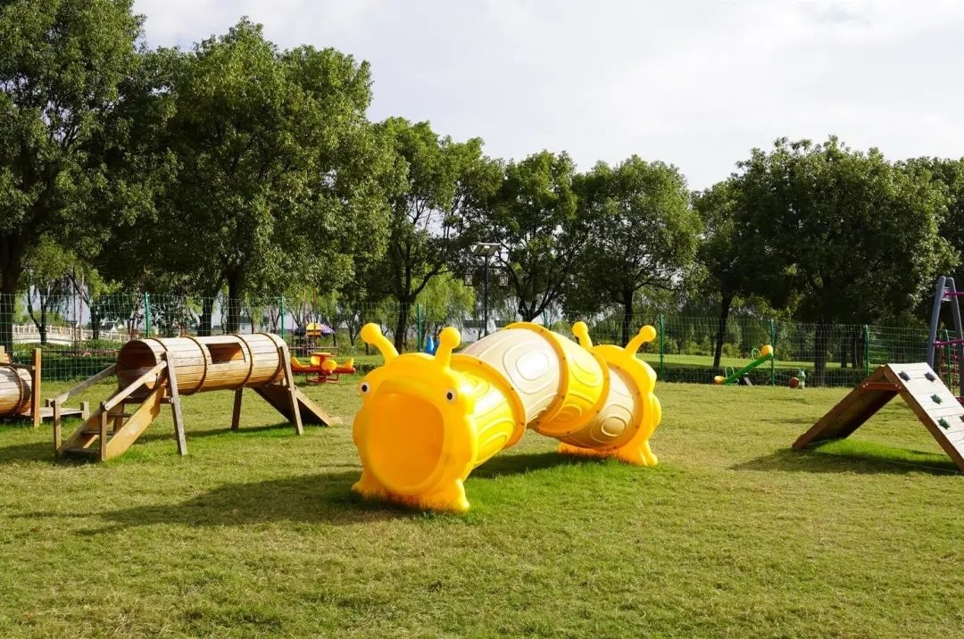 此外,这里也设有长凳、大帐篷等人性化的设施,适合狗狗的主人们放松一下。在宠物游乐场的左侧,还有一块儿童游乐区域,设有蹦蹦床、滑滑梯等一系列设施,供孩子游玩。