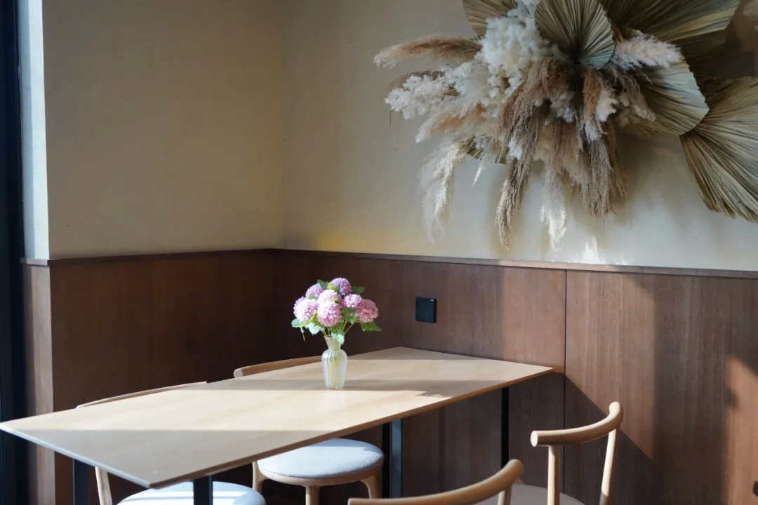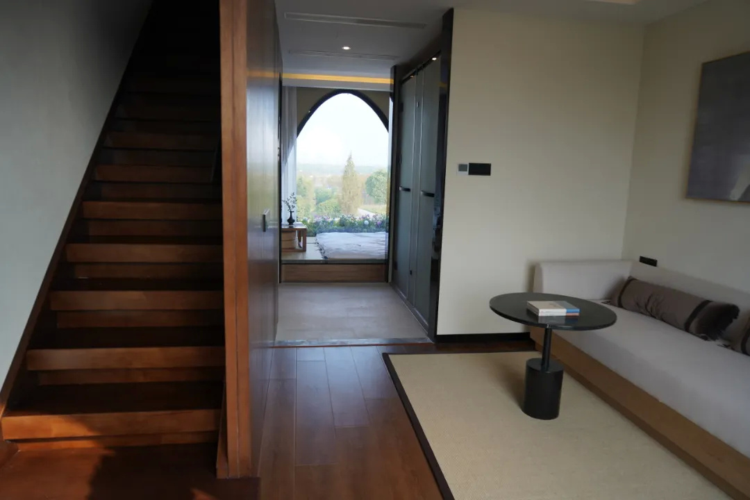 民宿套间内的高脚凳、吧台、圆木长桌,错落有致的摆放着;民宿后院,一体式的木板座椅由鲜花绿植包围,在微风的吹拂下格外灵动;客房内,住客可以透过半弧形的窗户看到大片的涵养林和朵朵白云。阳台上布置有浴缸、原木的座椅与书架,混合着若隐若现的香氛味,让人感到安然闲适;底楼的公共茶室内,布置着图书与茶艺用具,一茶一书就能让人静坐一个下午;若是透过每一层的窗户向外拍摄,越过窗沿上逼真的花饰,随手一拍即是大片。