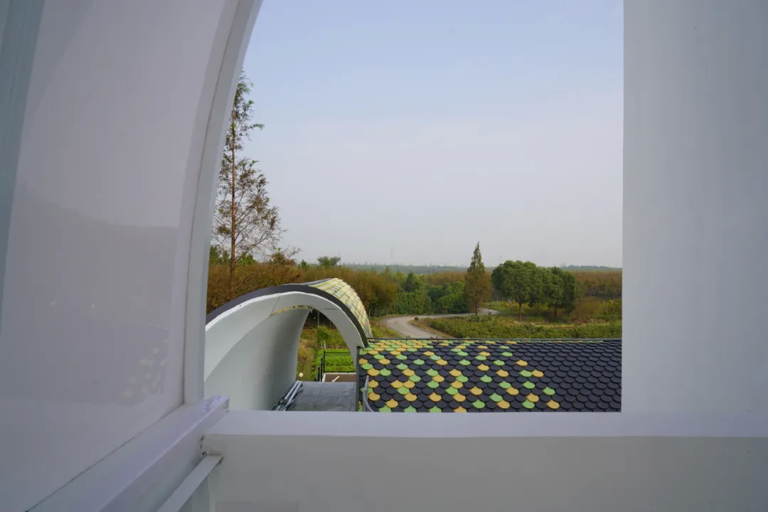 该民宿一共有三层,站立于任何一层观景,除了平行向远处看能看到一望无际的乡野风光外。层层向下看,因其独具匠心的设计,都能看到不一样的微景观。