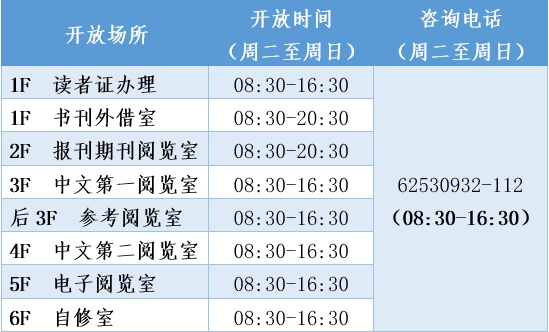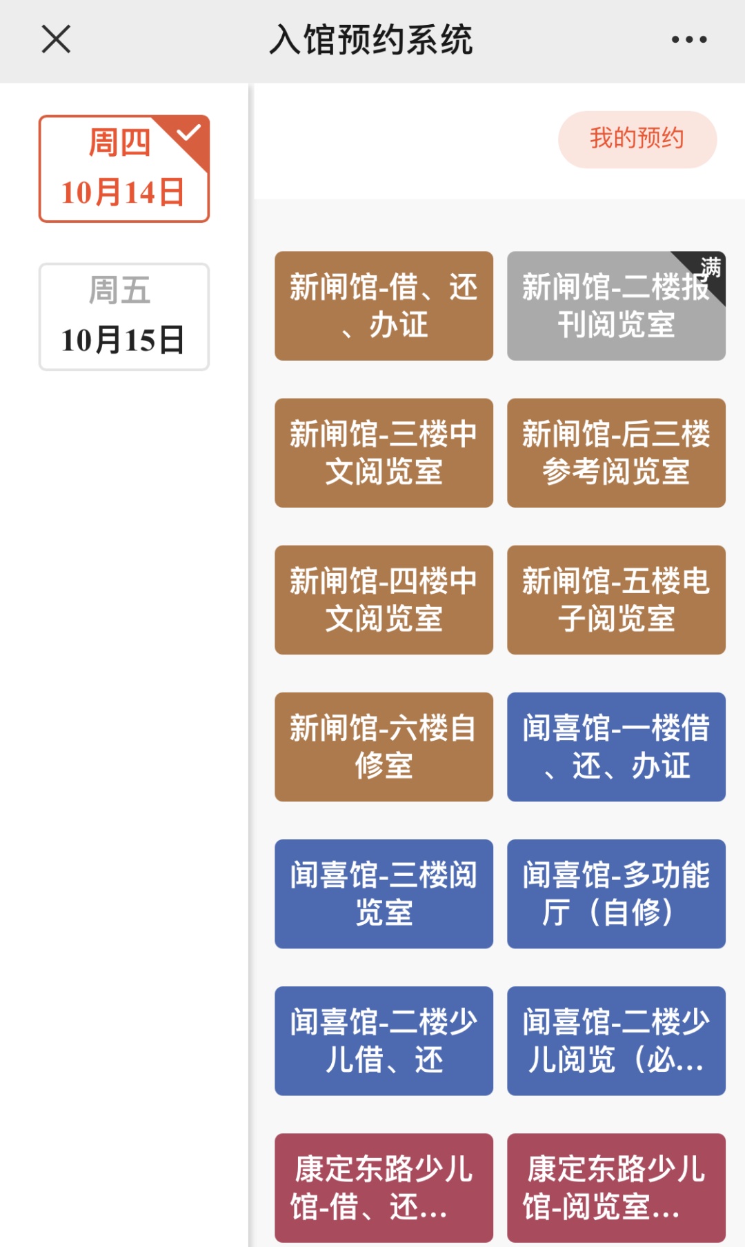 例如:想预约周四开放时间为8:30-20:30的阅览室,可在周二10:00-周四20:00时间段内进行预约。