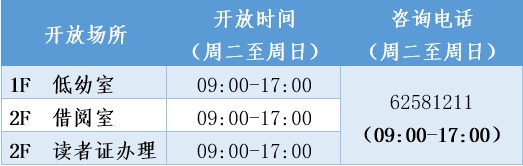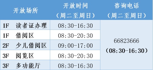 开放时间:新闸路馆、闻喜路馆:8:30-20:30;康定东路少儿馆:9:00-17:00。周二至周日开放,周一全天闭馆。
