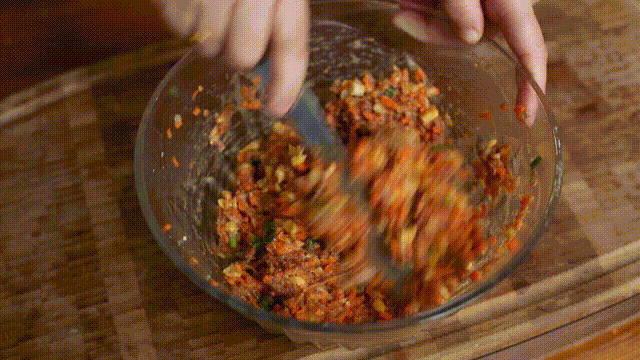 葱姜加温水泡1小时,取出葱姜水。将肉倒入大碗,分次加入葱姜水,顺时针搅拌,依次倒入生抽、老抽、蚝油、糖,搅拌均匀,加入盐、植物油拌匀冷藏一晚。取出冷藏好的猪肉馅,加入胡萝卜碎、玉米碎、香油、葱花、5克油拌匀。