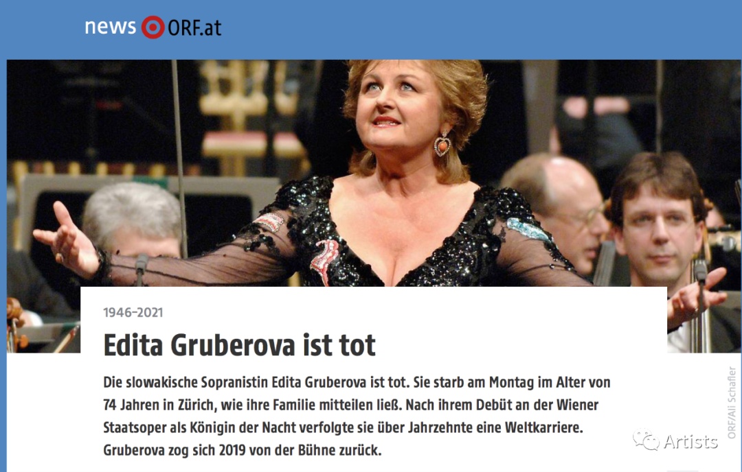 斯洛伐克女高音歌唱家埃迪塔·格鲁贝洛娃 (Edita Gruberova,1946-2021)于周一(10月18日)在瑞士苏黎世去世,享年74岁,这一消息是她的家人通过其经纪公司发布的,但死因并未公布。