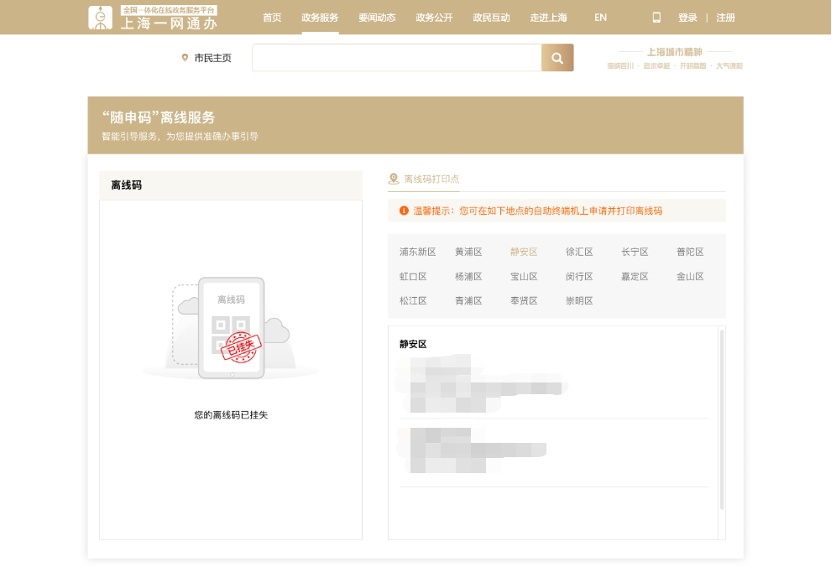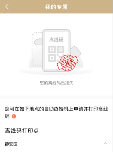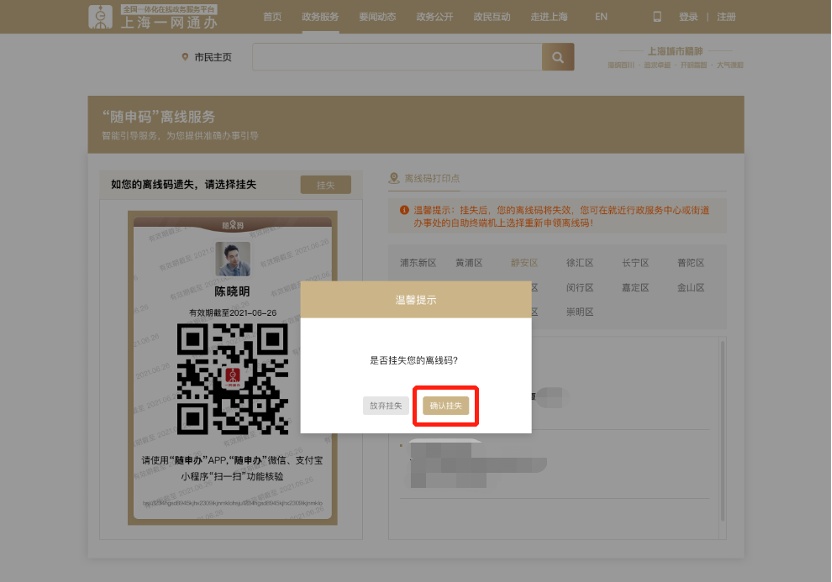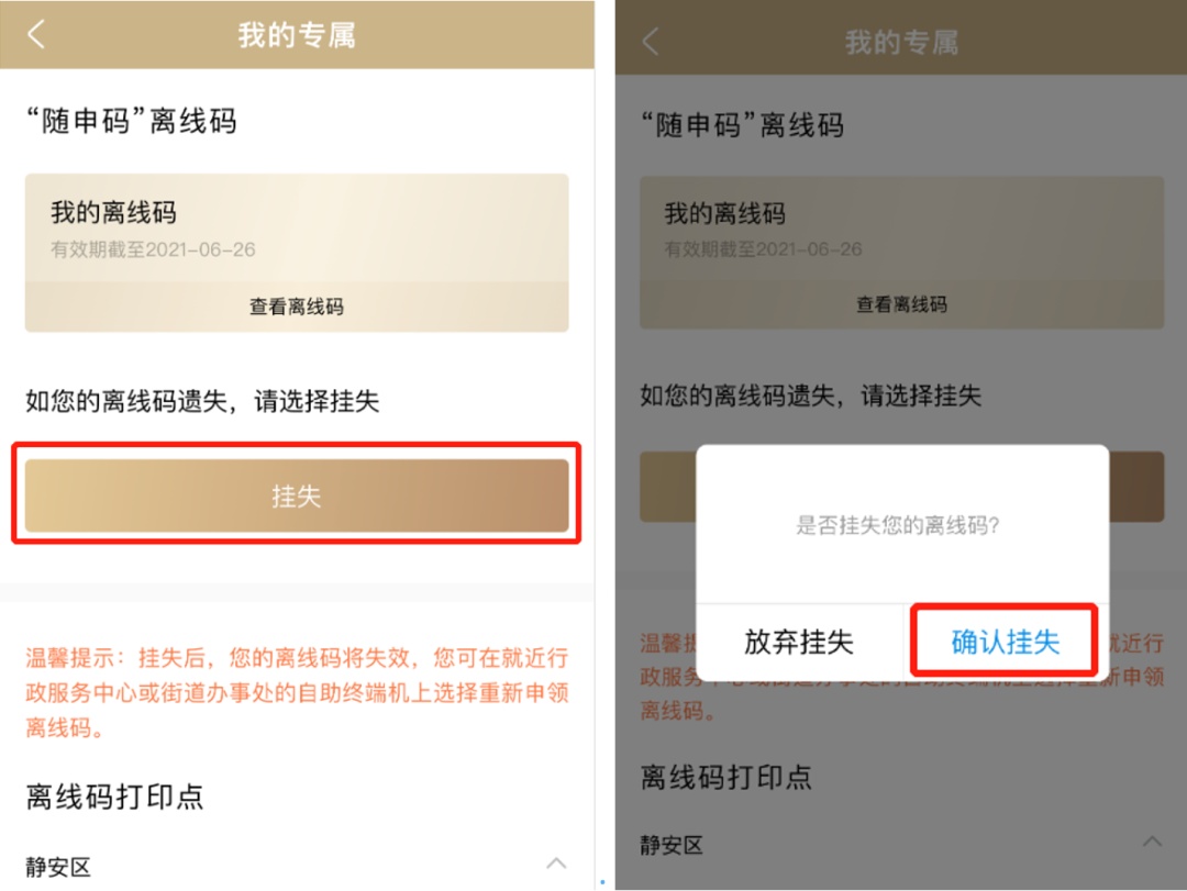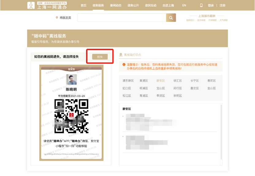 若“离线码”不慎遗失,可在“一网通办”或“随申办”移动端进行挂失,挂失成功后的“离线码”将立即失效,届时至区行政服务中心、社区事务受理服务中心自助终端机重新领取即可。
