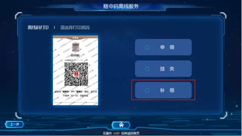 第三步:确认无误后,点击“补领”,通过自助终端打印“离线码”,选择“补领”后,之前申领的“离线码”将失效,无法进行核验。