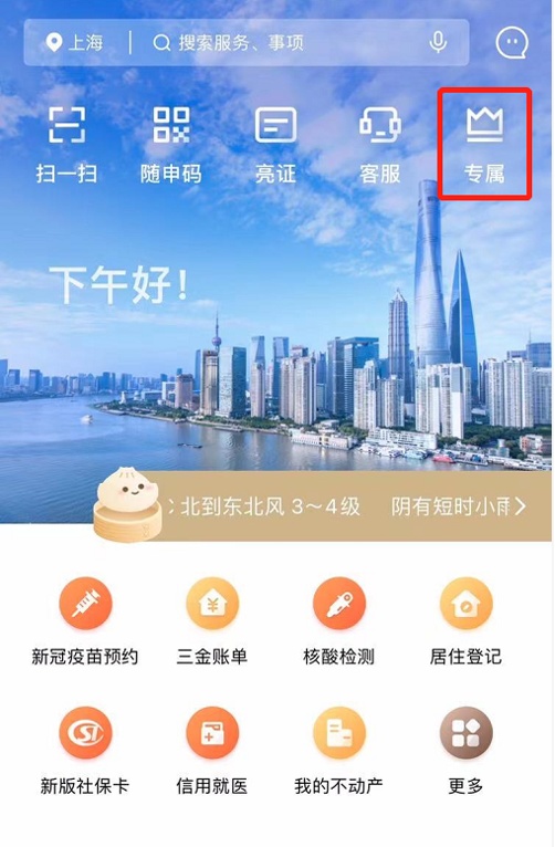 1.登录“随申办”APP或“随申办”微信小程序或“随申办”支付宝小程序,在首页点击“专属”,进入“我的专属”。
