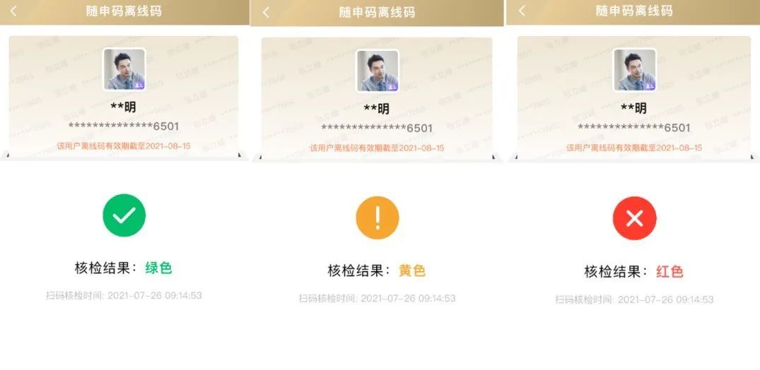 在需要核验的场所,出示有效期内的“离线码”,工作人员可通过“随申办”APP或小程序“扫一扫”识别核验。核验结果为绿色、黄色、红色,与线上“随申码”一致。