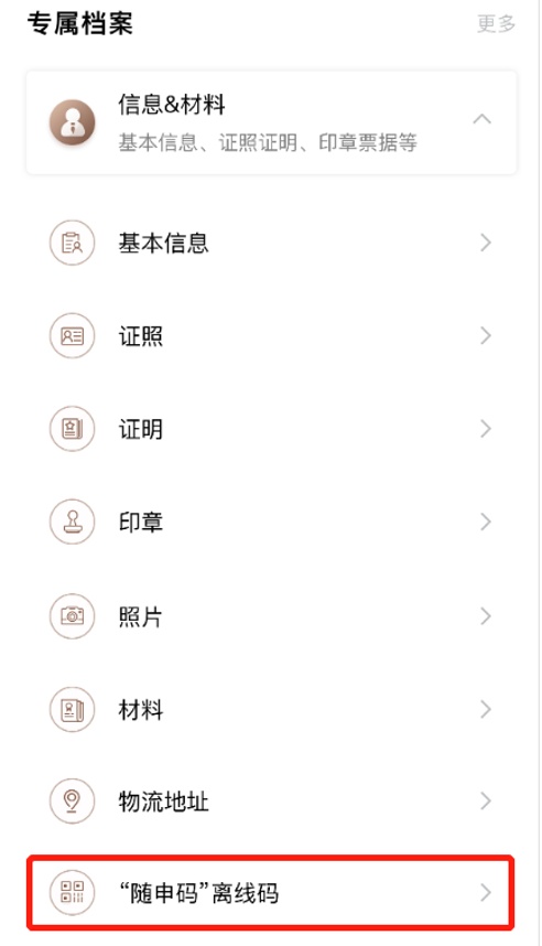 2.点击“信息&材料”——“随申码”离线码,进入挂失页面。