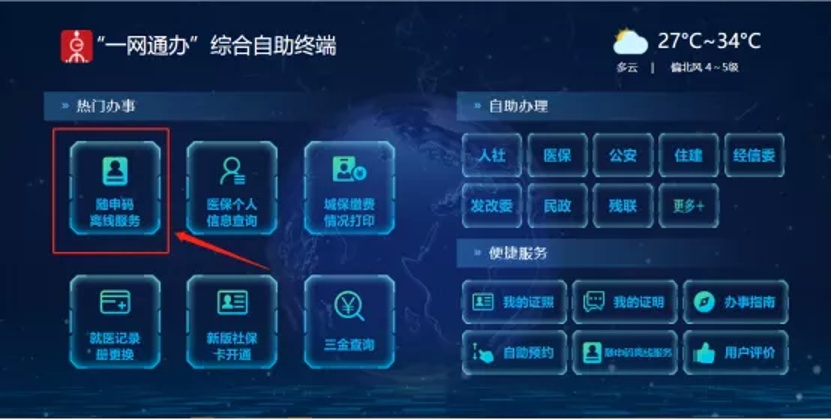 1、办理人在“一网通办”综合自助终端上点击“随申码离线服务”入口;