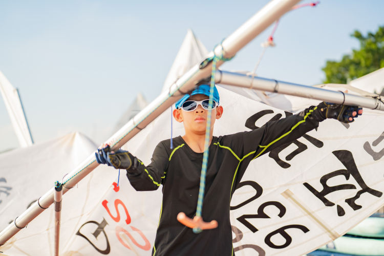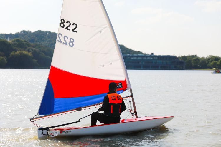 防晒偏光镜、帆船手套、防晒围脖、救生衣……穿戴好一系列专业装备后,小朋友们纷纷取帆入水,乘风破浪一展身手。每艘帆船只能容纳一名小朋友,他们要通过对风区、水浪走向的辨别和风向线的控制来操控帆船的方向和速度。