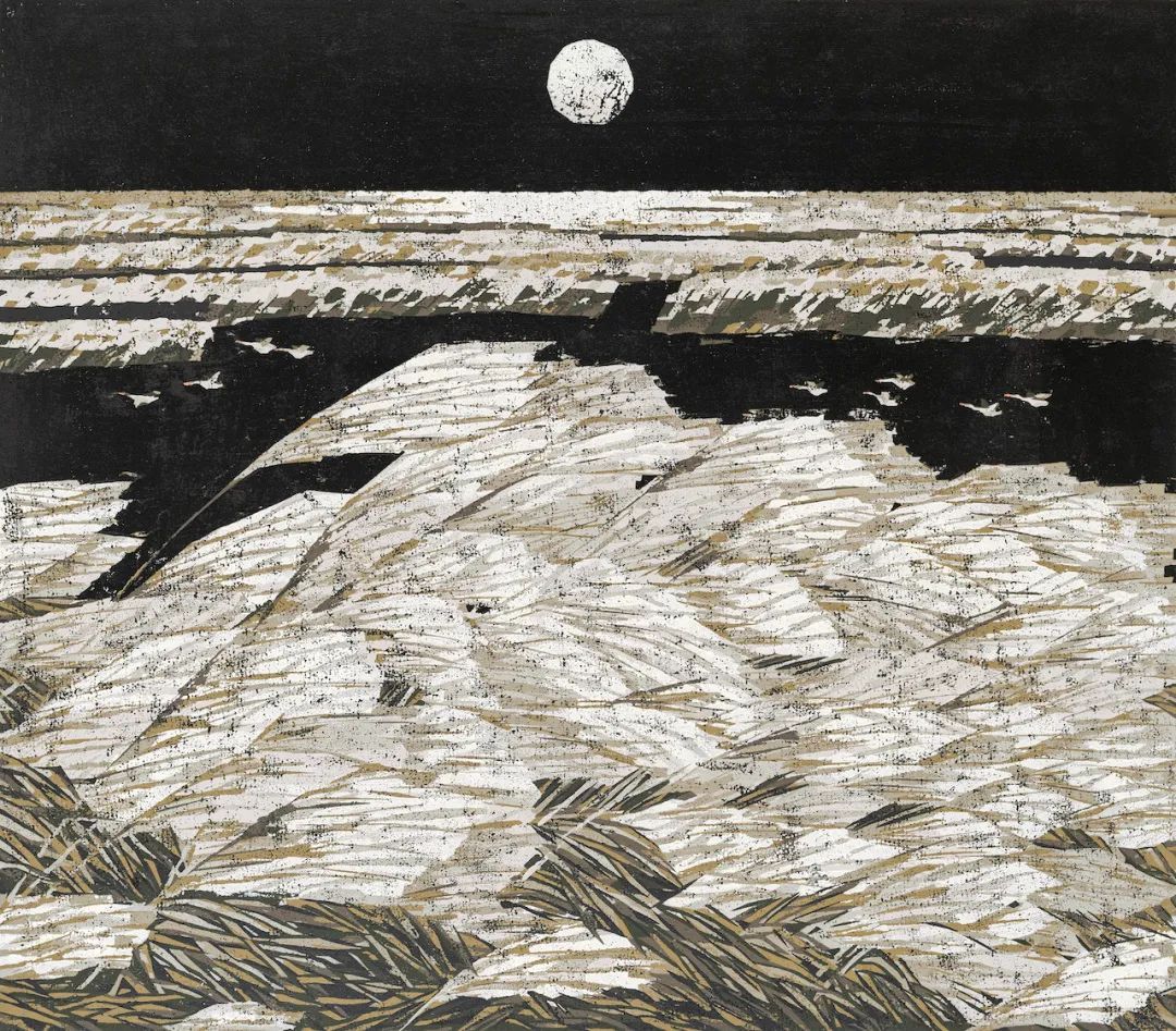 我以水为主要的创作元素,把记忆中那深青色的河湾、摇曳的芦苇丛、漂浮的水生植物、月光如水的原野等在水一方的景致融进画作,用所感所想,尽情地展现出水乡独特的灵秀、清丽、润雅之美。先后创作了《小村秋色》、《春回江南》、《梦里水乡》、《皓月》、《故乡情》、《颂秋》、《故乡组画》等作品。