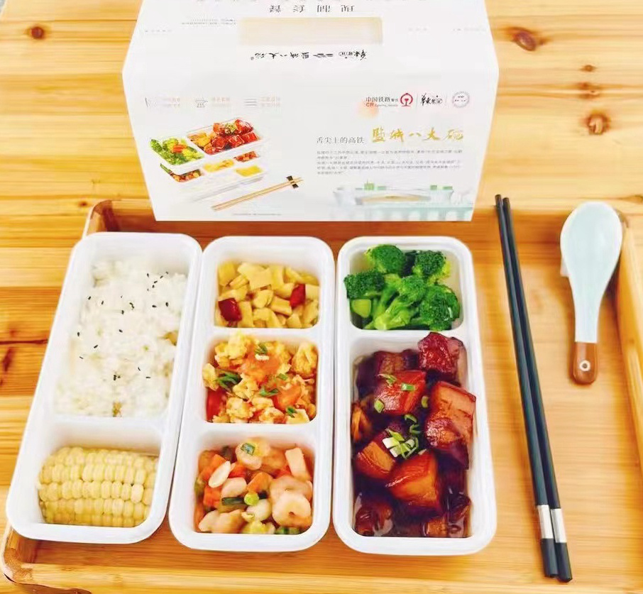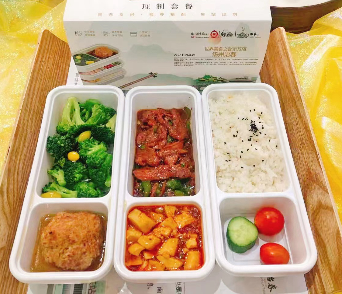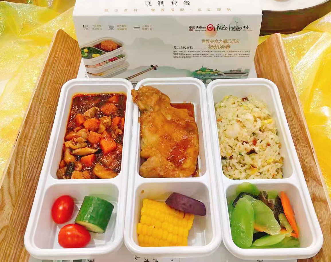 中国传统四大菜系之一的淮扬菜素有“东南第一佳味,天下之至美”之美誉。其中盐城“八大碗”深得淮扬菜精髓,口感清鲜,浓而不腻,淡而不薄,色、相、味、形颇具地方特色。此次车厢供应的高铁热链餐主要有盐城坨子肉、盐城烩土膘、扬州狮子头、扬州盐水鹅、扬州炒饭等为主打的10个品种套餐,分为40元、60元两种价位。后续将根据季节更新套餐品类,各款菜品均采用当季新鲜食材制作,四季各有不同。
