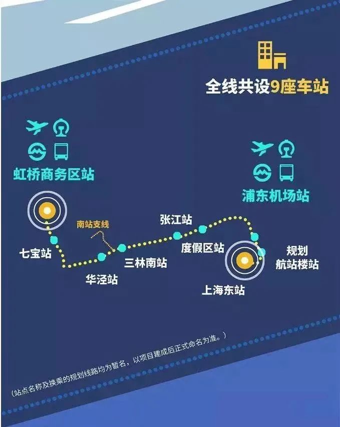 上海机场联络线线路全长68.6公里,途经上海市闵行区、徐汇区、浦东新区,全线预设虹桥、七宝、华泾、三林南、张江、度假区、浦东机场、规划航站楼、上海东等9座车站,设计时速160公里。