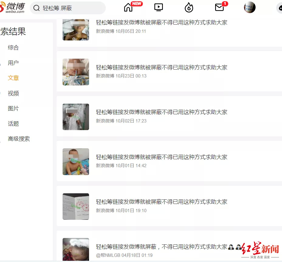 根据网友在网络上晒出的疑似骗子的用户信息截图,10月27日,红星新闻记者搜索相关用户信息,部分已无法检索到。记者在微博上检索关键词,能看到10余篇文章的标题均为《轻松筹链接发微博就被屏蔽不得已用这种方式求助大家》,文章头图照片中的患儿有的是同一个患儿,也有好几个不同的患儿,部分文章设置权限,记者无法查看文章具体内容。