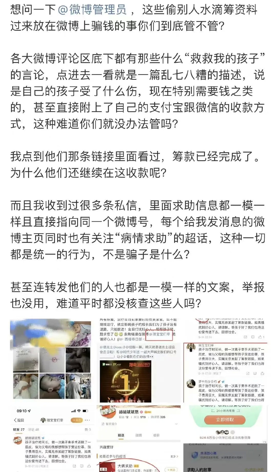 “王小七Fire”称,他在10月17日在微博热搜评论区看到一个求助消息,一名网友称孩子得了白血病需要治疗,点开用户信息,该用户发布了一个链接,文内有孩子的照片、治疗状况、家庭信息以及大量的煽情描述,最后附带了一张收款码。“王小七Fire”对此文的真实性表示怀疑,试图私信这个博主但信息无法发出,需“关注七天”后才可私信。