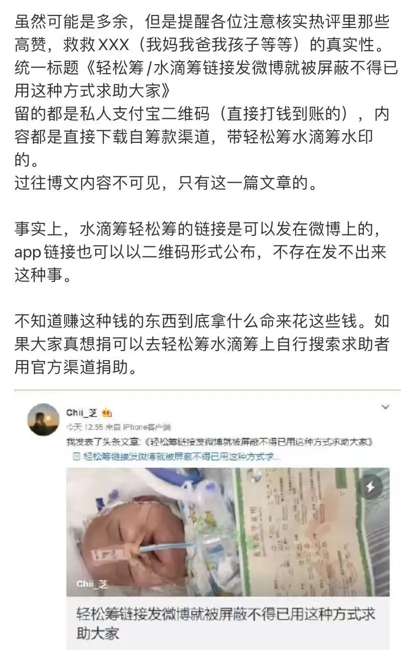 网友陈女士也在10月26日看到了标题为《水滴筹链接发微博就被屏蔽不得已用这种方式求助大家》的文章,“文章自带二维码,我捐了十元,还好没多捐,”陈女士今日发现发布文章的账户已被封号,“现在诈骗手段层出不穷,捐款也要仔细甄别一下真伪。”