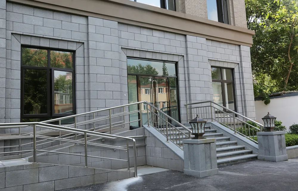 新建筑外墙立面青砖仿毛岗石修缮一新,内部功能分区严格按照医院运营的技术规范要求进行分割和装饰,在满足皮肤病医院的治疗、医美、科研等功能的基础上,帮助医院提升服务环境、流程及硬件设施功能。并在安防、消防、智能管理、新风系统等方面,参照新建筑的规范要求,不折不扣地建设到位,使医院的基础设施条件更上层楼。