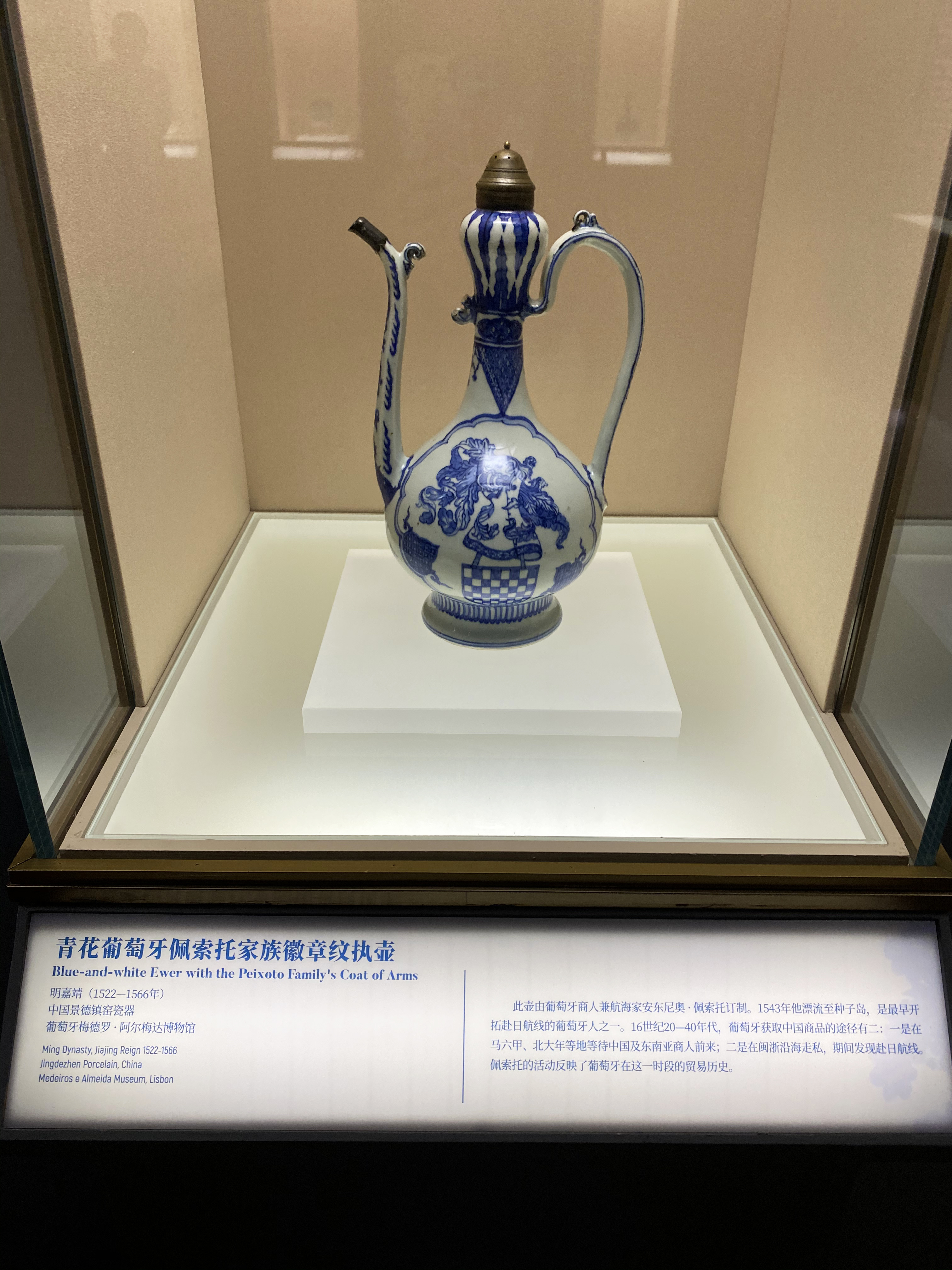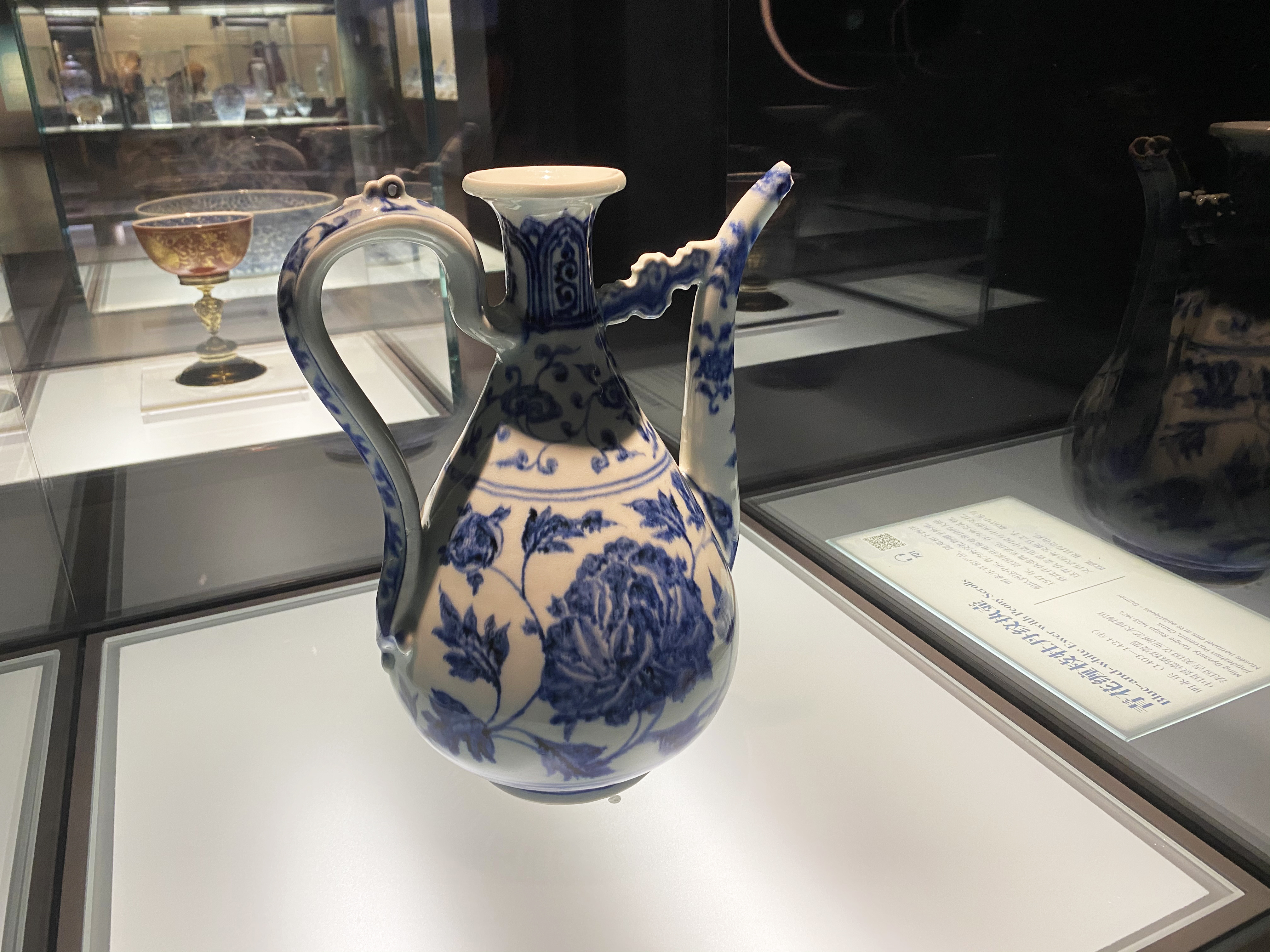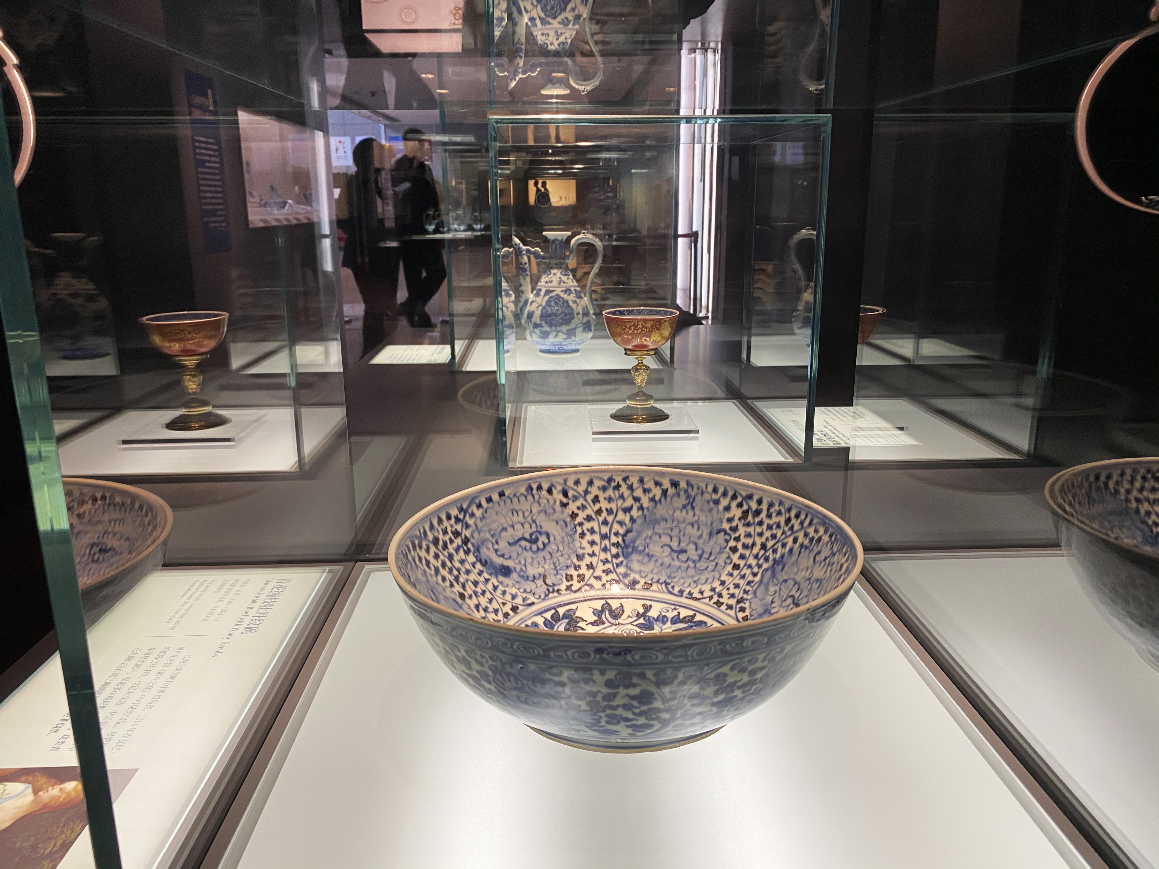 展览开篇,不仅有本文开头提到的这件珍贵的随郑和下西洋的青花执壶,还摆放着青花矾红描金缠枝莲纹碗和青花缠枝牡丹纹碗, 这三件颇具传奇色彩的器物不仅见证了特殊的流通历史,也开启了此后东方瓷器风行欧洲的先声。