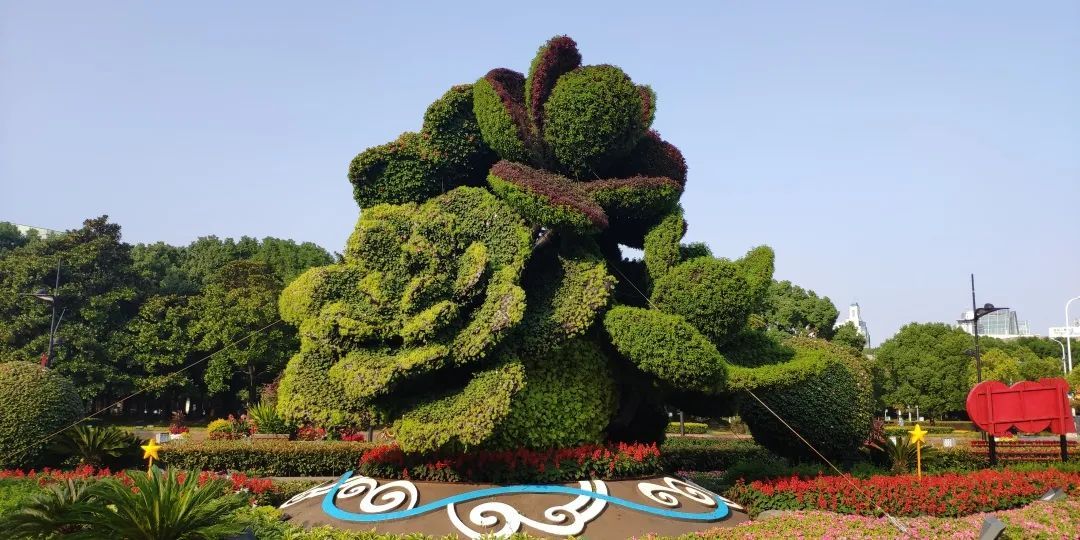 绿化养护工作者对东郊宾馆附近金科路龙东大道路口的绿雕进行了重点维护,本季度换花1443平方米,并点缀16个花球,共用63万盆穴盘苗及1.8万盆地面草花。路口东北角景点以国花牡丹作为主要配景,西北角景点以市花白玉兰为主要配景。