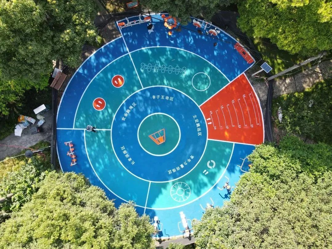 梅陇休闲苑内圆形的场地被分成了青年力量训练区、长者训练区、欢乐跳绳区、亲子互动区、立定跳远区,“圆心”区域则是拉伸伸展区。