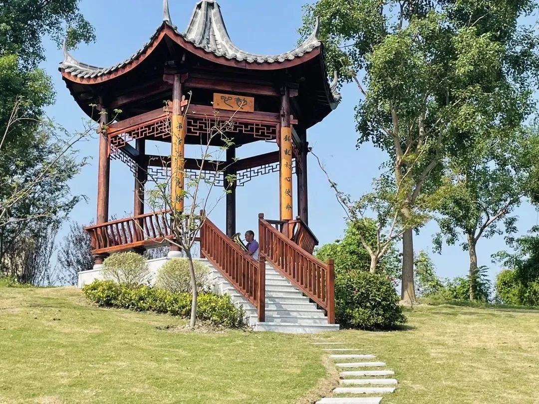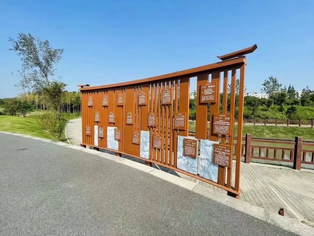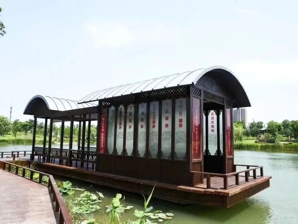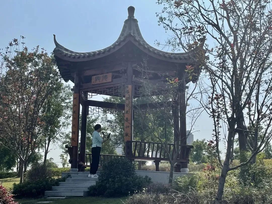 更值得一提的是,得翠园还有一个特别的身份——梅陇镇党建公园,集党建文化宣传和市民休闲娱乐于一体。园内将党建元素与原有绿地功能有效融合,设有红色主题广场、红船形式的市民亲水平台、主题文化凉亭、党建文化雕塑、诗词景观石等,党建文化弥漫整个公园。