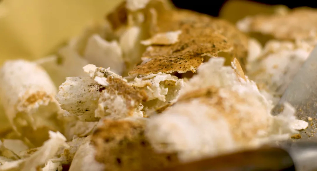 等到整个铁锅都摊上了白白的锅巴,到适当的厚度,就可以用一把铲刀把锅巴一块一块地铲下来,锅巴就变成了饭糍。