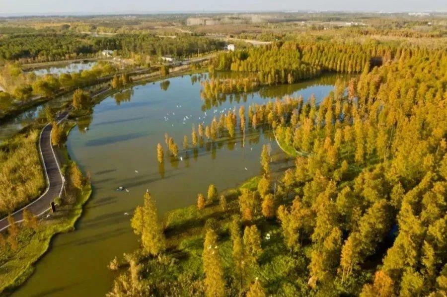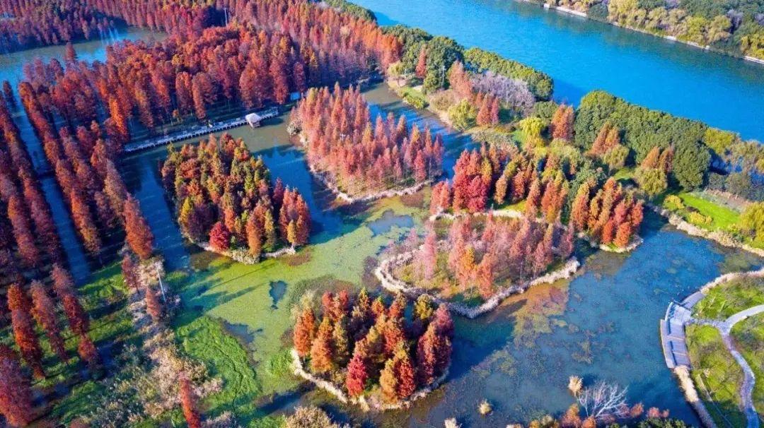 “百亩池杉抒秋意,枫叶荻花秋瑟瑟。”这里有60多亩的水上森林——池杉林,虽还未到层林尽染之时,但也有无尽的诗意与野趣。粉墙黛瓦,稻田鱼塘,河湖荡滩,树林花丛,描绘出广阔的郊野田园风光。