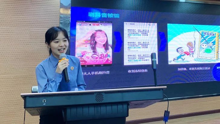 宣讲中,检察官为同学们准备了类型丰富的诈骗普法小视频、图片,重现诈骗场景,让学生更直观地了解电信网络诈骗的常见类型、特征,用一个个生动的案例揭示了诈骗分子的常用手法,并有针对性地总结了防骗贴士。