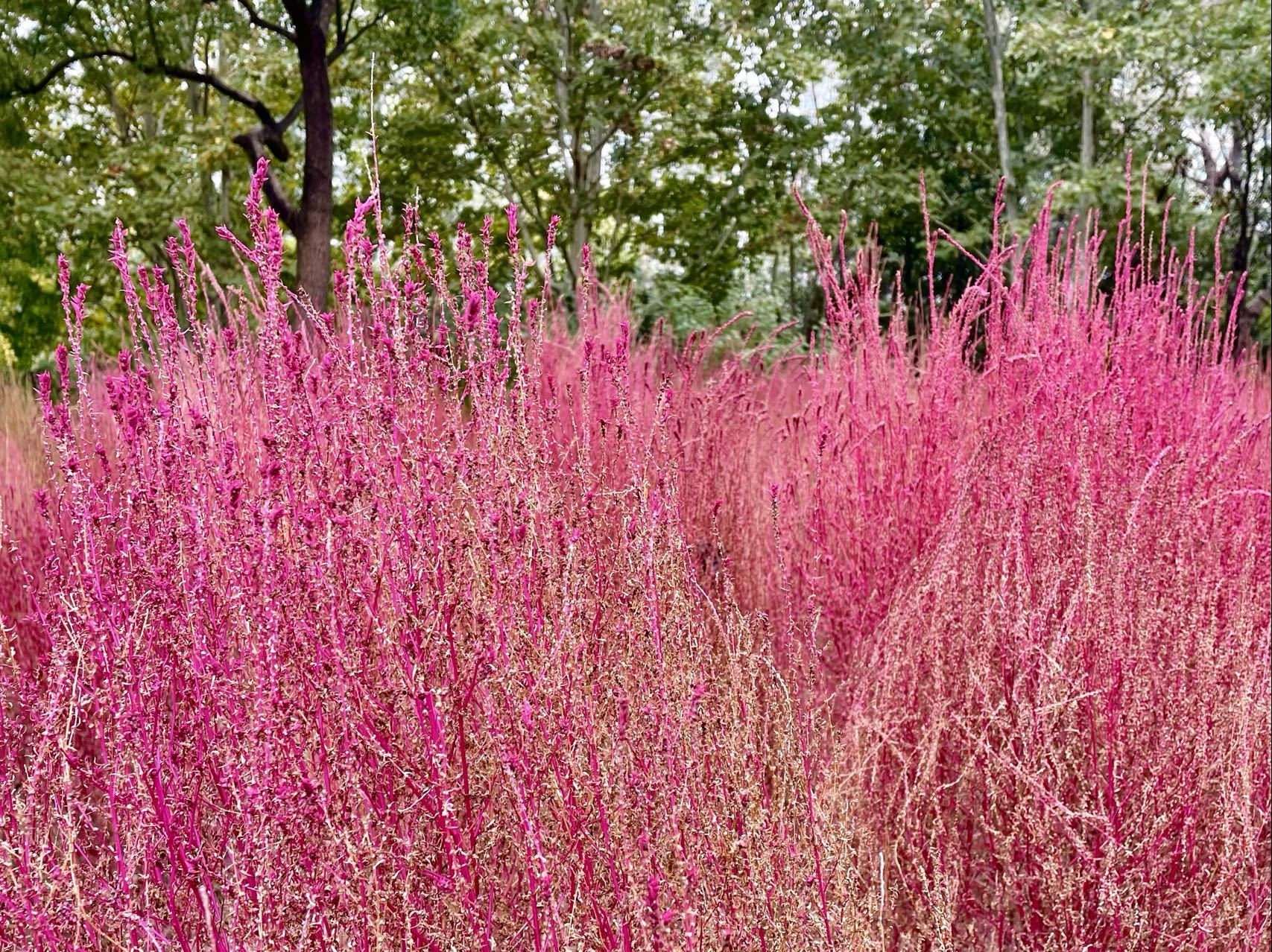地肤一年四季都能生长,它能随季节变化呈现出不同的颜色。春夏嫩绿,深秋渐变成火红,冬天干燥枯黄,一年四季都在变装,渐变的油画色为秋日的公园添上斑斓的一笔。