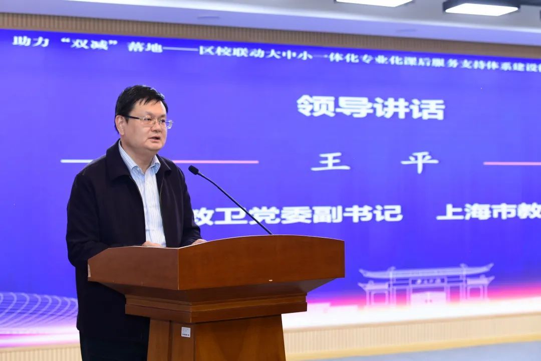王平在讲话中指出,近年来,杨浦区和复旦大学不断深化区校联动发展,持续开展了形式更多样、内涵更丰富、外延更广阔的交流合作,有利促进了学城、产城、创城“三城融合”,校区、园区、社区“三区联动”。大中小一体化专业化课后服务支持体系建设行动,是区校双方坚决贯彻党中央、国务院和市委、市政府关于“双减”工作部署,合力促进杨浦中小学生和学前儿童身心健康、全面发展的有力举措,既为杨浦更加扎实落实“双减”政策提供了高水平智力支撑,也为复旦大学的专家学者更全面了解杨浦党情、区情、社情、民情创造了更好渠道。期待杨浦和复旦延续良好的区校合作传统,进一步探索大学生社会实践和中小学生课后服务对接通道,加强中小学生课后服务资源建设,形成学校、家庭、社会协同育人的合力,为推动杨浦乃至全市“双减”工作的全面落实加油助力,加快走出一条超大城市落实“双减”政策的新路径,共同为全国超大城市基础教育优质均衡发展贡献上海方案。