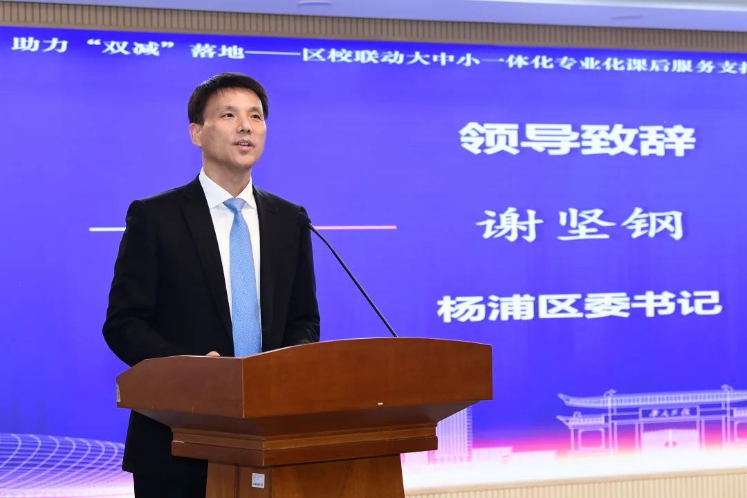 谢坚钢在致辞中表示,复旦是国人自主创办、教育报国的大学,始终坚守着立德树人的初心,践行着“为党育人、为国育才”的使命。杨浦是教育大区,区委、区政府历来高度重视学校发展,与复旦的合作源远流长、基础深厚、成绩斐然。开展中小学生课后服务,既是贯彻落实“双减”政策的具体举措,也是杨浦践行人民城市重要理念的应有之义。希望双方以此次合作为契机,全面贯彻落实党的教育方针,以促进学生身心健康成长为导向、以破解课后服务关键问题为目标、以高质量专业研究和服务为依托、以系统性解决方案为突破,共同研究和探索义务教育课后服务的新模式,培养更多德智体美劳全面发展的社会主义建设者和接班人,为深入推进“双减”工作提供更多可复制、可推广的“复旦-杨浦”样本。