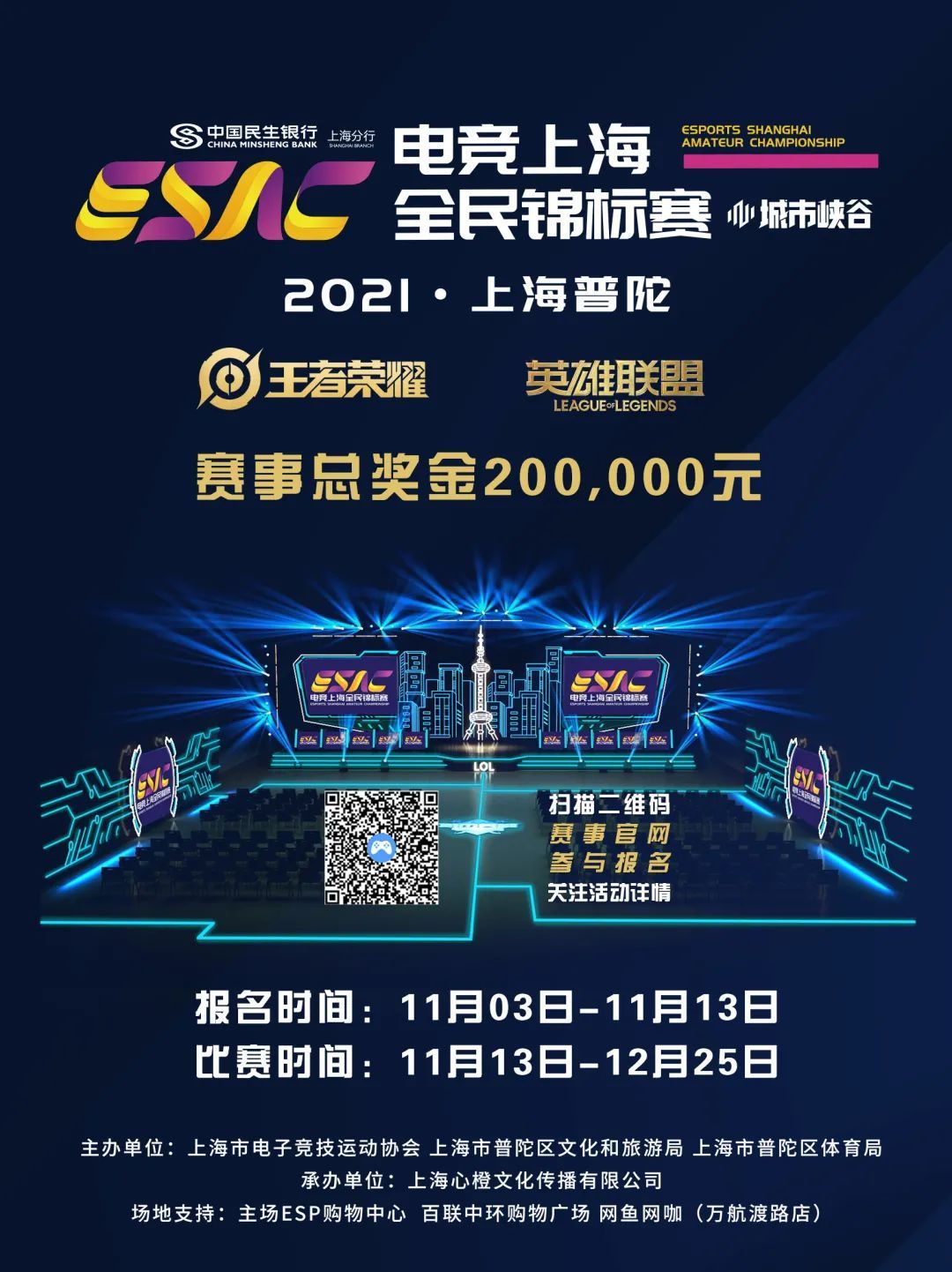 作为普陀区打造的全民参与的重要电竞盛事,电竞上海全民锦标赛将赋予电子竞技在文化、体育、科技等的多元价值,开辟新的电竞赛事风向标。该赛事作为助力上海建设全球电竞之都的重要措施之一,由上海市电子竞技运动协会、上海市普陀区文化和旅游局、上海市普陀区体育局联合主办。赛事项目为《王者荣耀》《英雄联盟》,赛事总奖金额为20万元,整个赛程持续至年底,计划将在普陀的热门商圈和赛馆——主场ESP购物中心、百联中环购物广场、网鱼网咖(万航渡路店)展开线下角逐。参赛队伍可通过多维度的场景和多层次的体系,体验职业赛事策划所带来的激烈比拼。据悉,这是上海唯一具有政府背景,融合不同区域、不同项目的全民电竞赛事平台,旨在培育规范化、标准化的赛事品牌,营造健康、绿色、向上的良性氛围,进一步构建本市电竞赛事的完备体系。通过职业水准的赛事体系运作,集中展现申城电竞全民参与的深厚氛围以及电竞产业的整体实力。