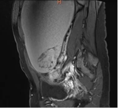 住院后进一步的检查结果令人瞠目。盆腔MRI发现了娇小瘦弱的她肚子里竟藏着一个30多公分的大包块,霸占了几乎整个盆腹腔,盆腔血管里也有血栓形成。
