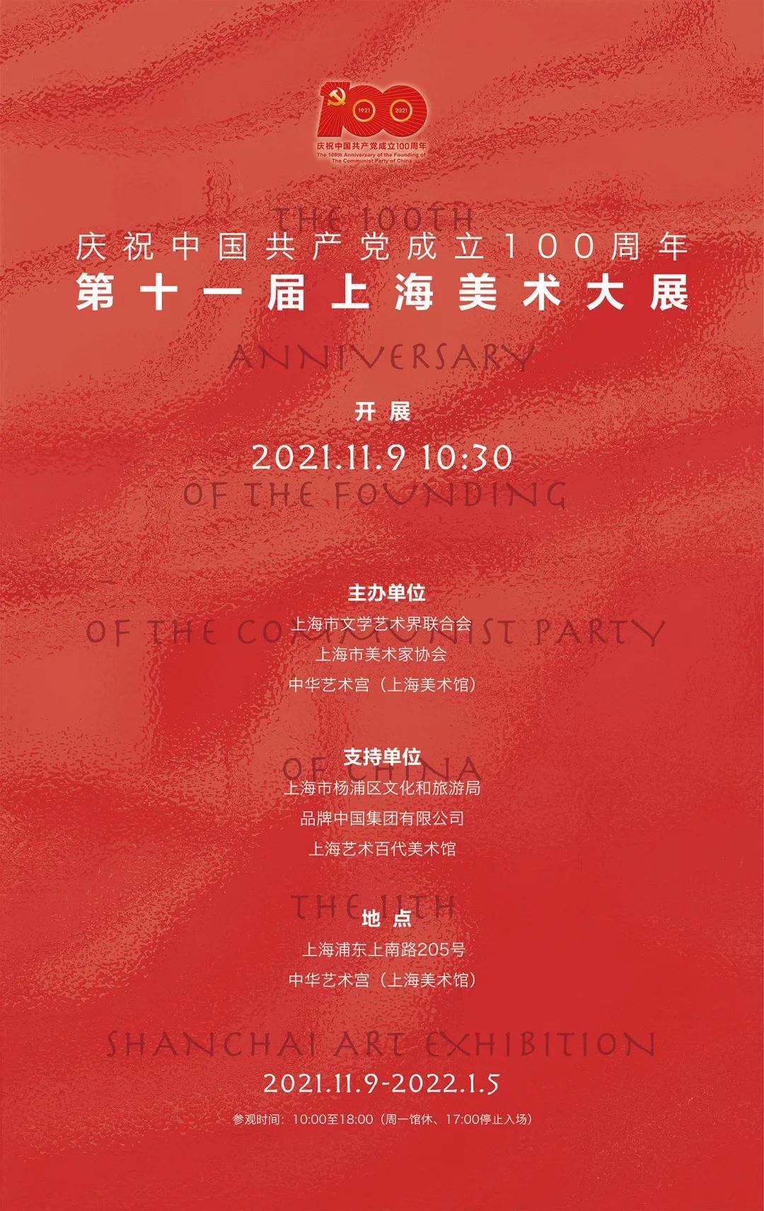 为庆祝中国共产党成立100周年,由上海市文学艺术界联合会、上海市美术家协会、中华艺术宫共同主办的第十一届上海美术大展于2021年11月在中华艺术宫隆重举办。围绕“庆祝中国共产党成立100周年”主题,聚焦全面建成小康社会的伟大成就,充分展示近两年来上海美术创作的优秀成果,集中呈现上海美术界自觉肩负“举精神之旗”“铸时代之魂”“展人民形象”时代使命的整体形象,着力彰显“上海美术”在全球化艺术格局中鲜明的中国精神、中国气派、中国风度,是本届大展的目标所在。