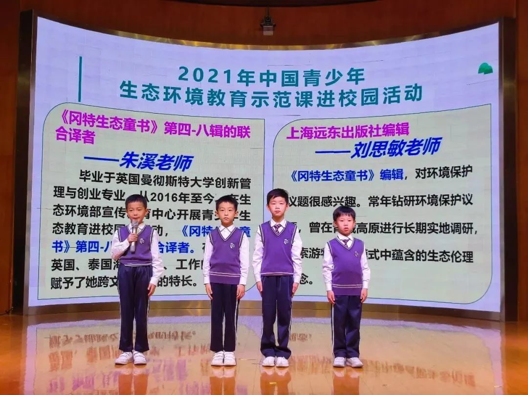 为助力COP15,丰富青年参与平行会议的内容,鼓励更多青少年参与生物多样性保护,2021年11月2日至11月3日,2021年中国青少年生态环境教育示范课进校园活动(上海站)暨《冈特生态童书》进校园活动在上海市民办协和尚音双语学校、上海市闵行区汽轮科技实验学校举行。