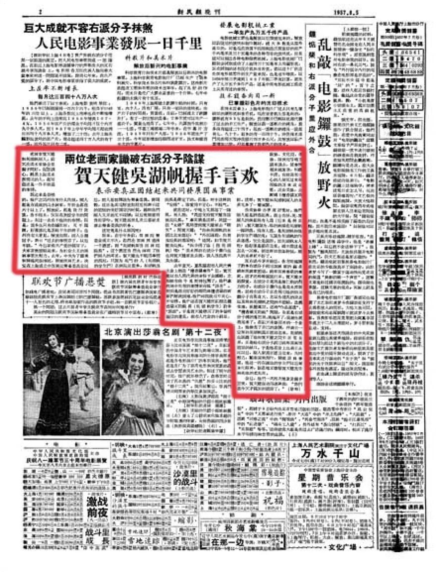 上:1957年8月5日,《新民报晚刊》刊发贺天健与吴湖帆握手言欢