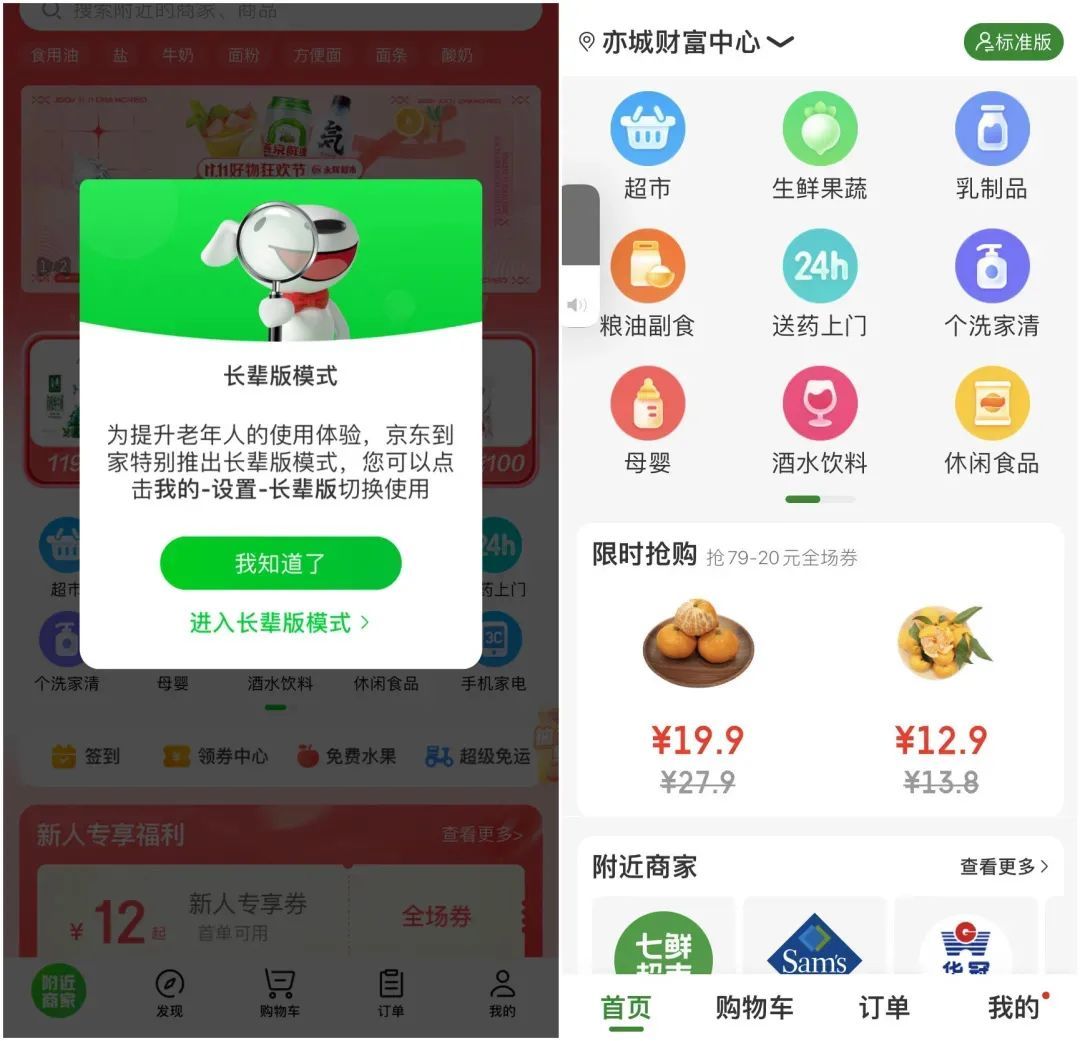 为此,京东到家专门成立项目小组,对APP页面设计、流程设置等功能进行重新规划和优化升级。推出的“长辈版”模式,能提供大字体、极简功能选项,让页面浏览更清晰简洁,让老年用户快速找到所需商品信息,购药买菜更加便捷。并设置可一键切换回标准版。