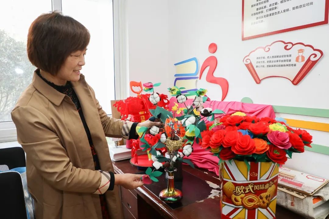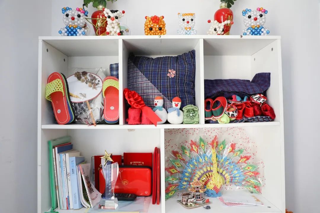 阿姨还兴致勃勃地向我们介绍其他“巧手队”的成果,有无纺布插花、手工拖鞋、串珠玩偶、折纸孔雀......五彩斑斓、琳琅满目的手工艺品体现着“巧手队”的创意与风采。
