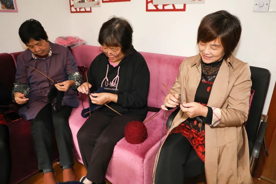 小编来到了金汇镇和苑居委文化微家,一走进去,就看见阿姨们正热热闹闹聚在一起织毛线、聊家常,欢声笑语充满了整间屋子。