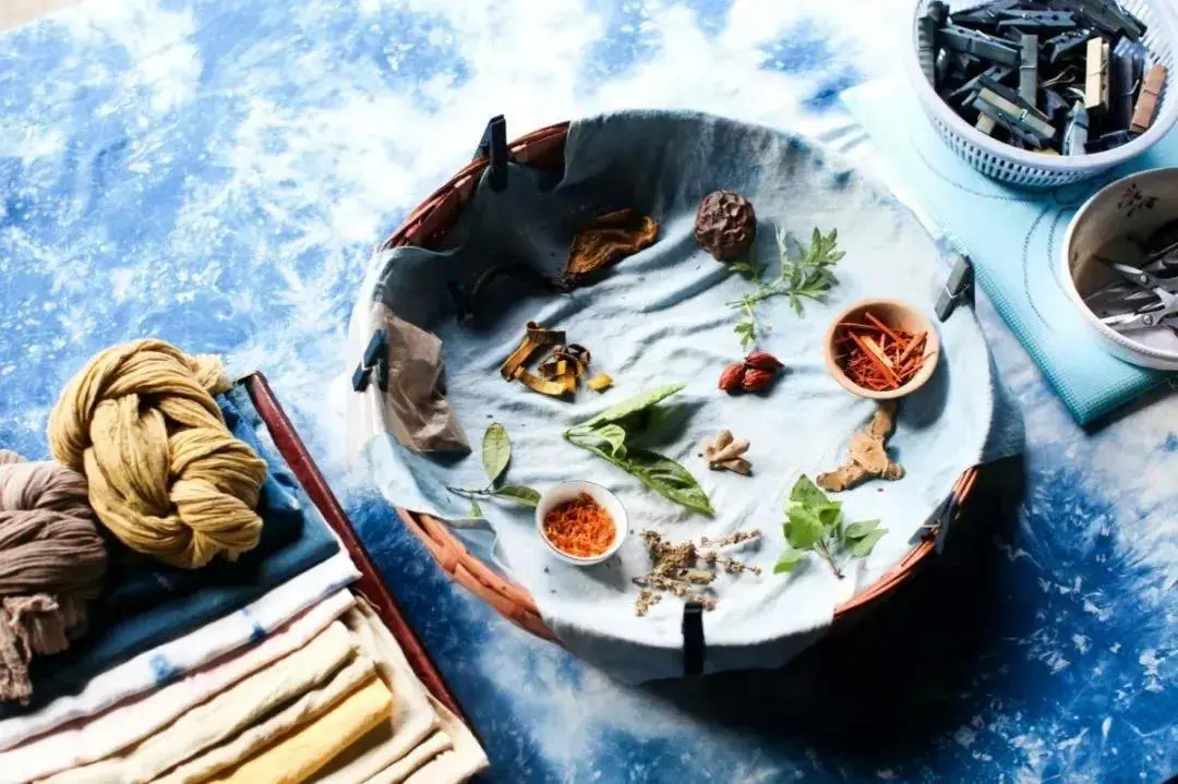 使用的染料多数为中药材的植物染料,均提取自植物的根茎叶、草木灰、黄豆粉等,具备药性,对身体无害,是安全环保的染色方式。