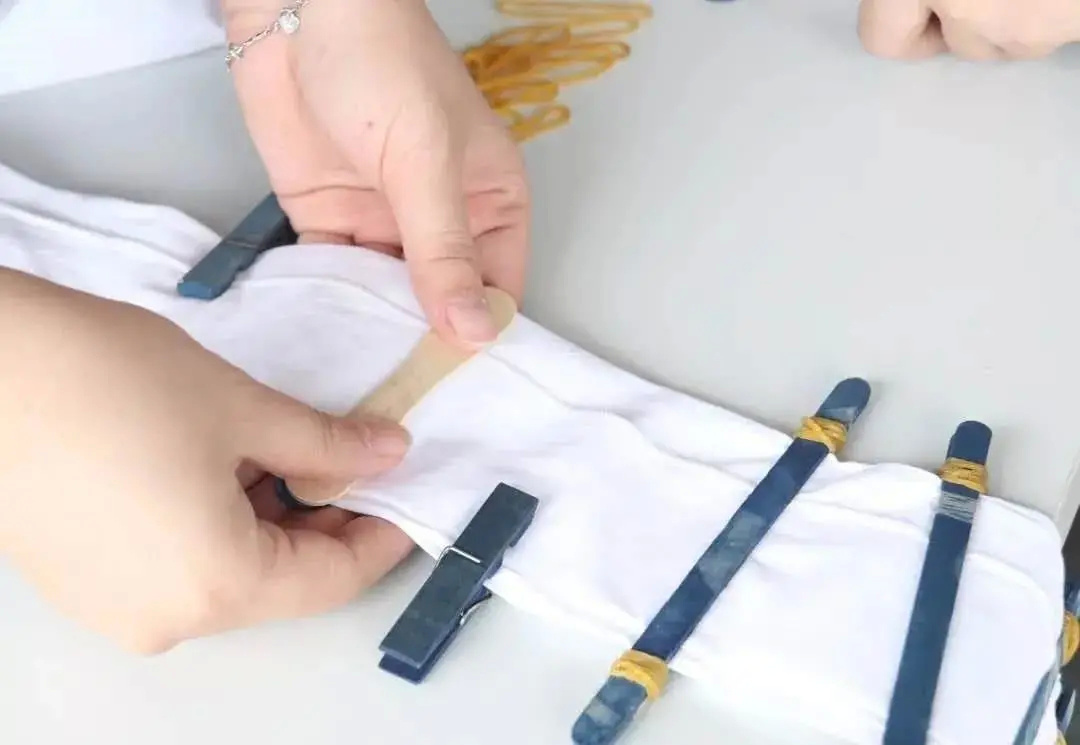 扎染师傅通过纱、线、绳等工具,对织物进行扎、缝、缚、缀、夹等多种形式组合后进行染色。被紧扎起来的部分不会被染上颜料而保持原色,不同的扎结方式会染出各种不同的花纹、图案。