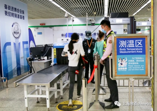 在徐泾东站站厅长通道,一眼望去,吊顶上挂满了中英文提示的展板,引导参展乘客出行。徐泾东站通过设置“持证通道”为参展乘客提供了更便捷的方式进入场馆。同时,进站测温区也新增了中英文提示的海报。