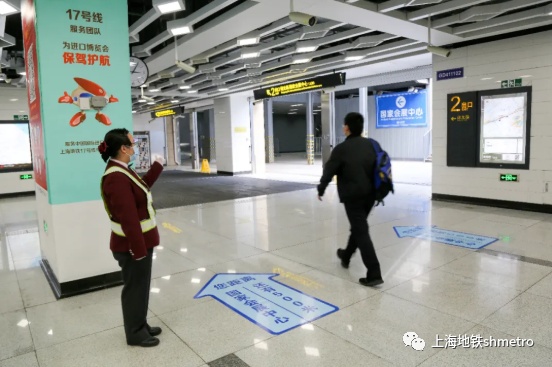 在总结前三届进博会的分流经验后,诸光路站增加了导向,观博客流一出2号口闸机就能发现“您距离国家会展中心还有500米”的醒目地贴。地下通道内也有同样的地贴引导。此外,在通道口还增加工作人员加强巡视,做好现场的指引。同时,车控室值班员密切监控客流情况,确保运营有序。