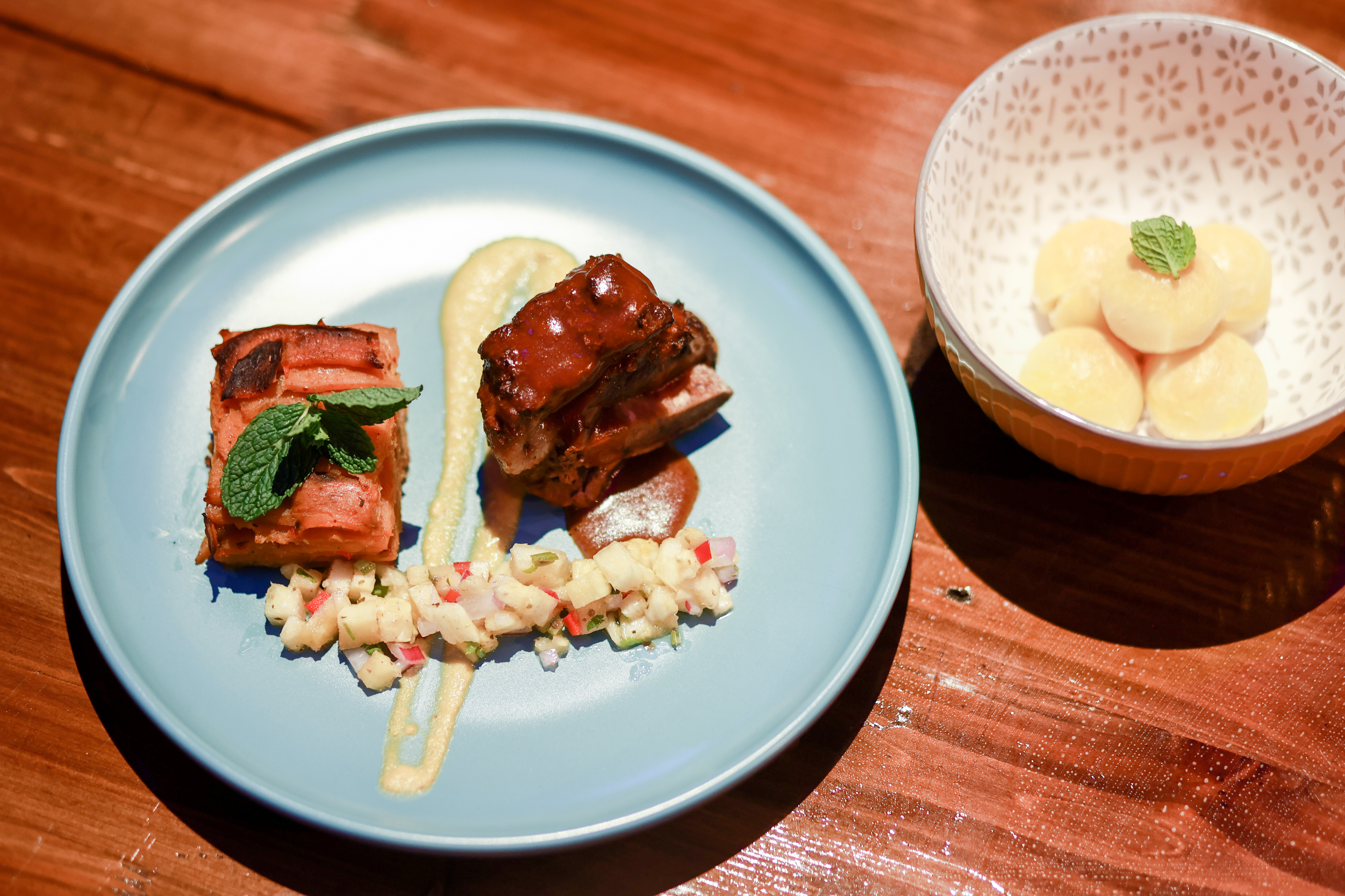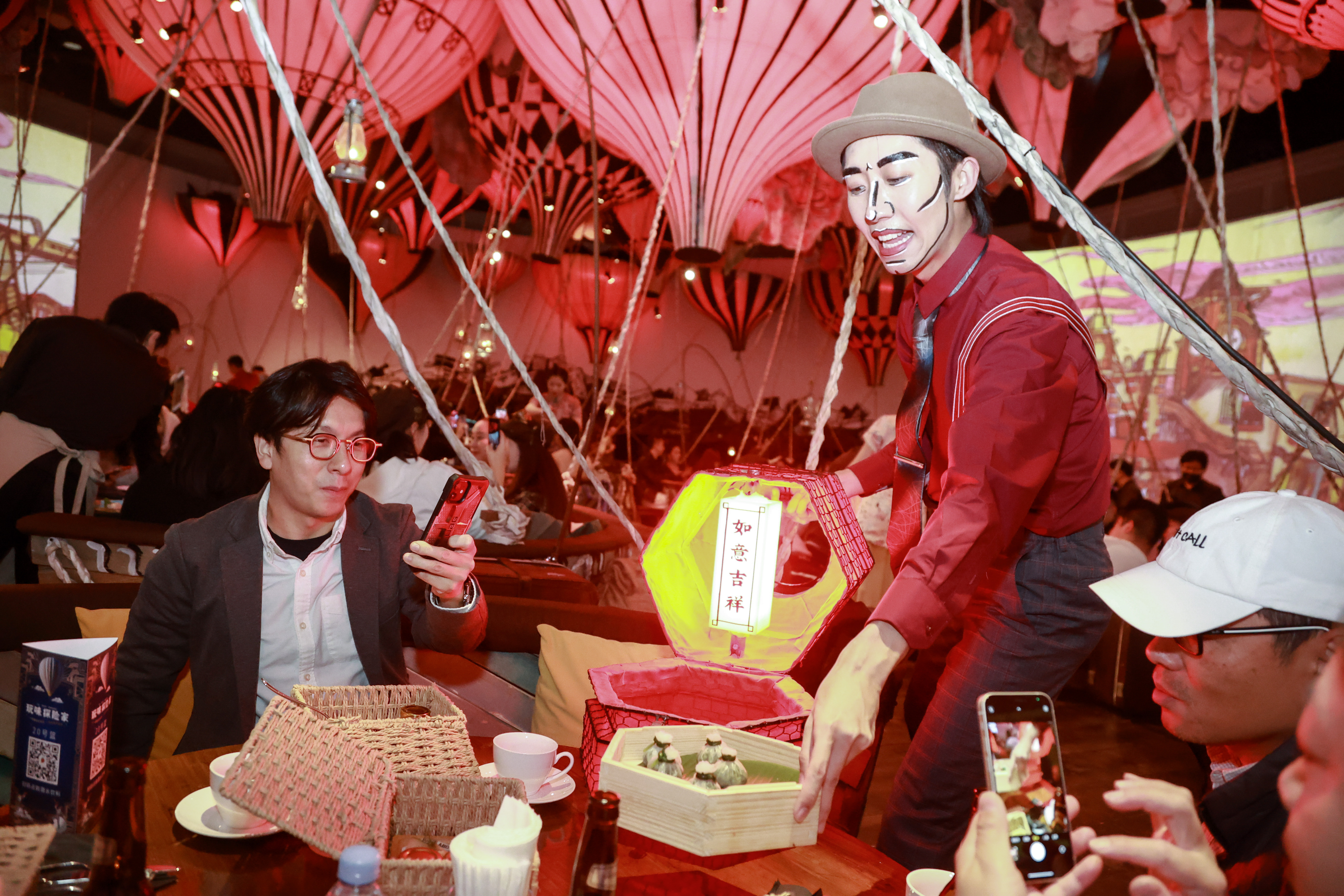 相较于首轮演出,此次在兴业太古汇开启的二轮演出,不仅演出场地更大、舞台效果更加凸显艺术化,由中英顶级团队联手打造的“上海幕”演出尤其让人感到耳目一新,吸引了不少观众争相前来“二刷”。在熟悉的旋律中,环形巨幕中出现了上海的地标——东方明珠,还有各种有着深刻海派文化印记的生活场景。演员们一边骑着老式自行车,一边摁响自行车铃叮铃声将人瞬间带回到石库门弄堂,一起丢沙包、跳房子,在弄堂里找回曾经的童趣。除了视听效果,以香菇、荠菜、玉米为馅的清晨露珠水晶包、四喜烤麸、绵香熏鱼、白玉肉卷、翡翠白玉糕等菜品和点心都是地道的“上海味道”。
