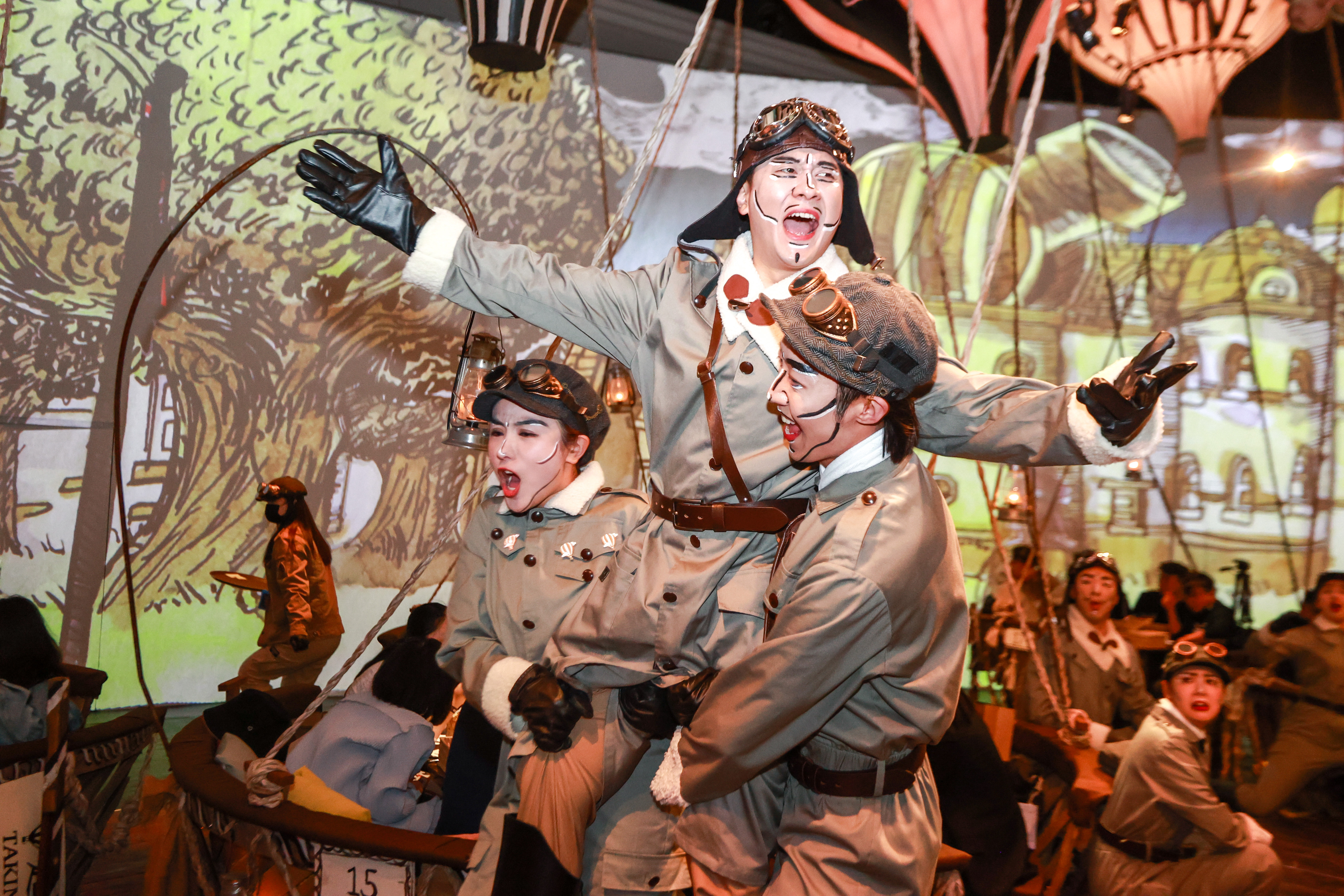 在“值机柜台”办理完“登机牌”后,观众就可以进入“热气球”的安检口处——一本展开的童话书,穿越层层云朵后进入神奇的绘本世界,化身乘坐“热气球”的“探险家”,开始一段时长90分钟的环球旅行。在整个旅行中,“大风兄弟”吹动热气球,指引着“探险家”们从英国格林威治出发,途径亚洲,俄罗斯,巴西,最后飞向外太空。环形巨幕带来的多媒体效果、歌舞表演、肢体剧、默剧和世界美食则给“探险家”们带来身临其境的沉浸感和互动感。