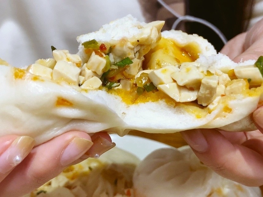 刚出锅的豆腐包,外皮虽薄但韧性十足。红色的辣油浸透表皮,观其色就已垂涎欲滴。